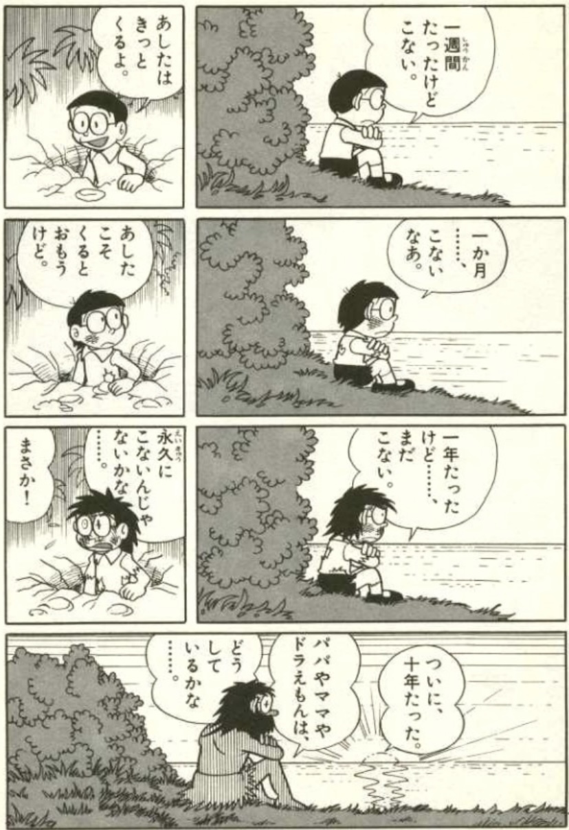 てんとう虫コミックス14巻に収録されている「無人島へ家出」にて、のび太は無人島で救助を待ちながら10年の歳月を過ごしている。