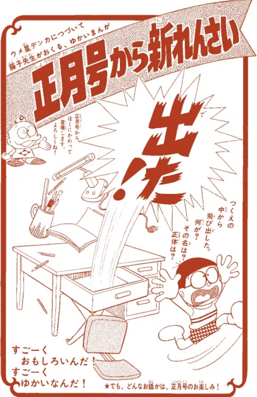 藤子・F・不二雄先生はドラえもんの予告を出した時点で何も考えておらず、締め切りギリギリになってもタイトルも主人公も思い浮かばなかった。朝、娘の人形につまずいたのがきっかけとなり、ドラえもんがまとまる。